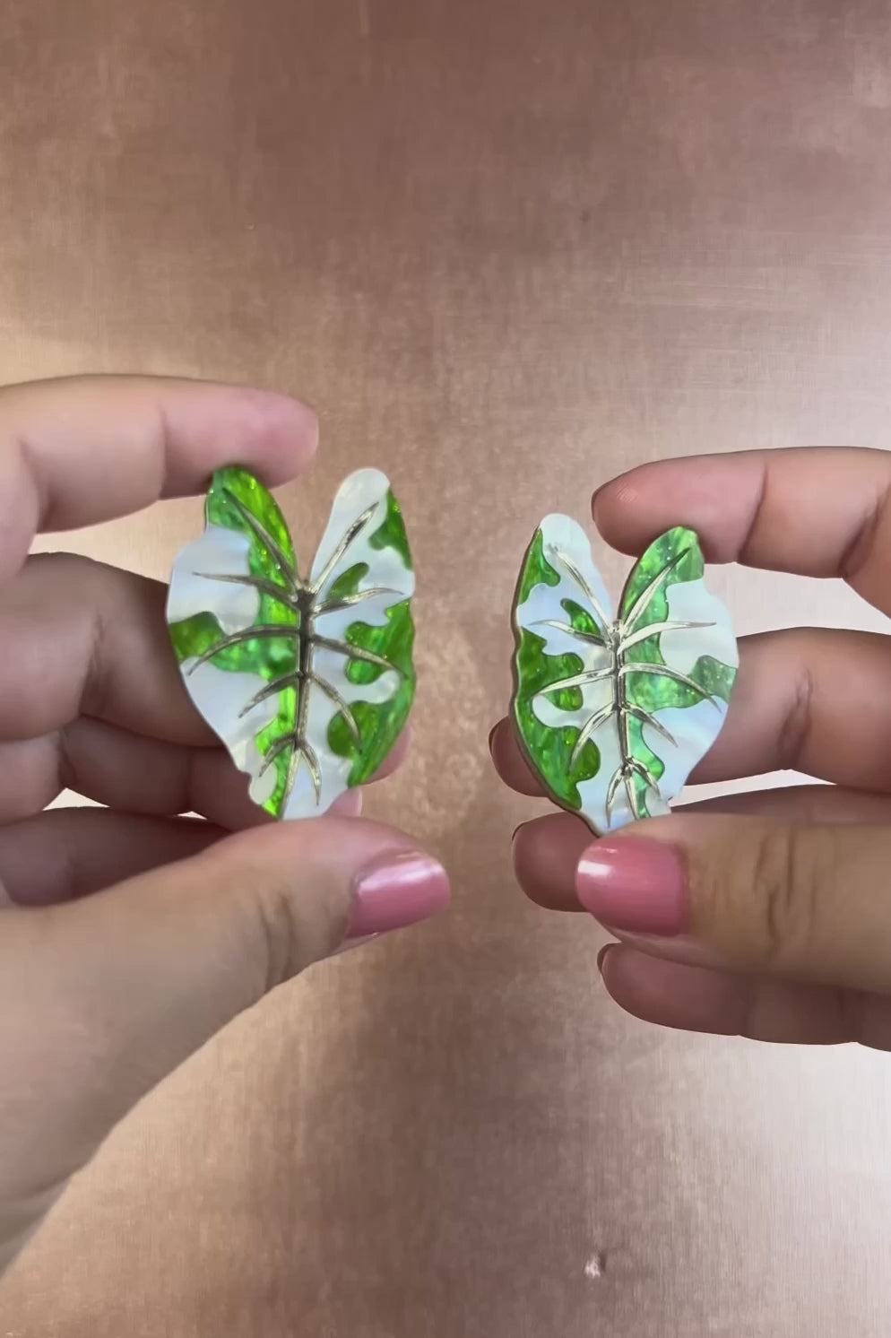 Setzen Sie mit Alocasia-Ohrringen ein Statement – auffälliger, handgefertigter, leichter Schmuck, inspiriert von der Schönheit der Blätter der Alocasia variegata.