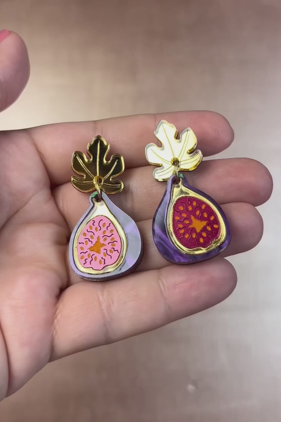- Einzigartiges Design: Leuchtende, violette Feigenanhänger mit pinkfarbenen Details und einem goldglänzenden Blattmotiv.