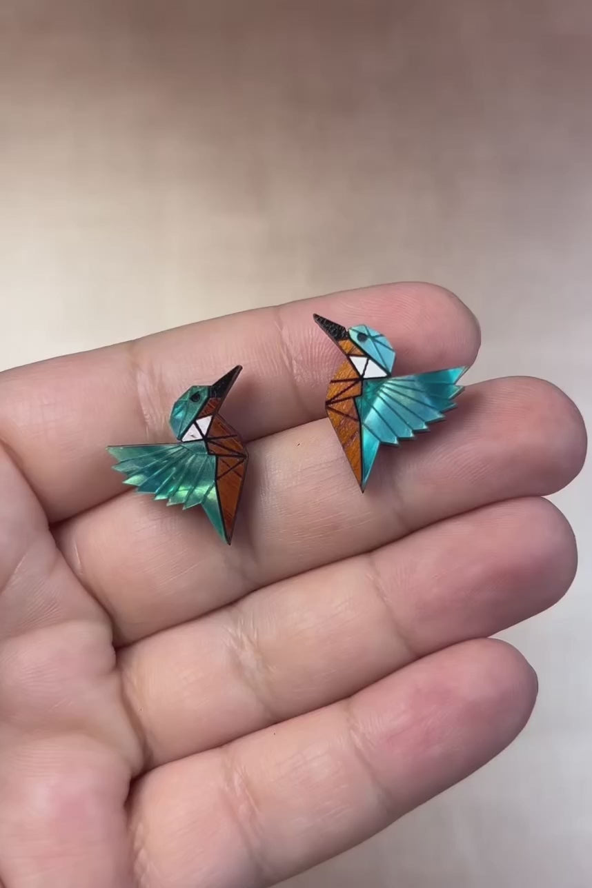 Entdecken Sie den umweltfreundlichen Charme unserer Eisvogel-Ohrstecker aus recyceltem Holz und leuchtendem Acryl. Leicht, stilvoll und nachhaltig hergestellt!