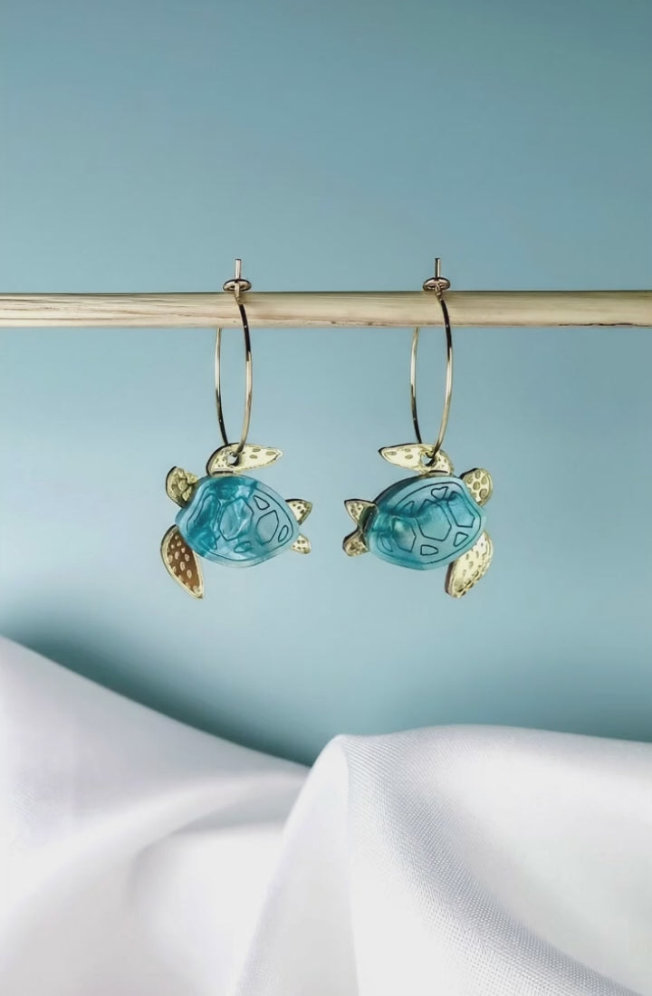 Verleihen Sie Ihrem Stil Charme mit den handgefertigten Meeresschildkröten-Reifen. Sie bestehen aus einzigartigen türkisfarbenen und goldenen Acrylschildkröten an eleganten goldenen Creolen.