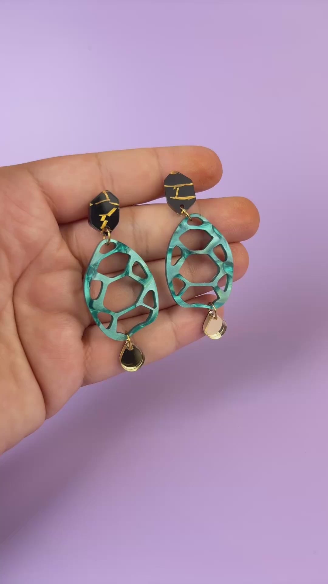 Die nachhaltigen und stilvollen Wasserohrringe verwandeln Acrylreste in schillernde Accessoires in Blaugrün-, Schwarz- und Goldtönen. Handgefertigte Schönheit ohne Abfall!