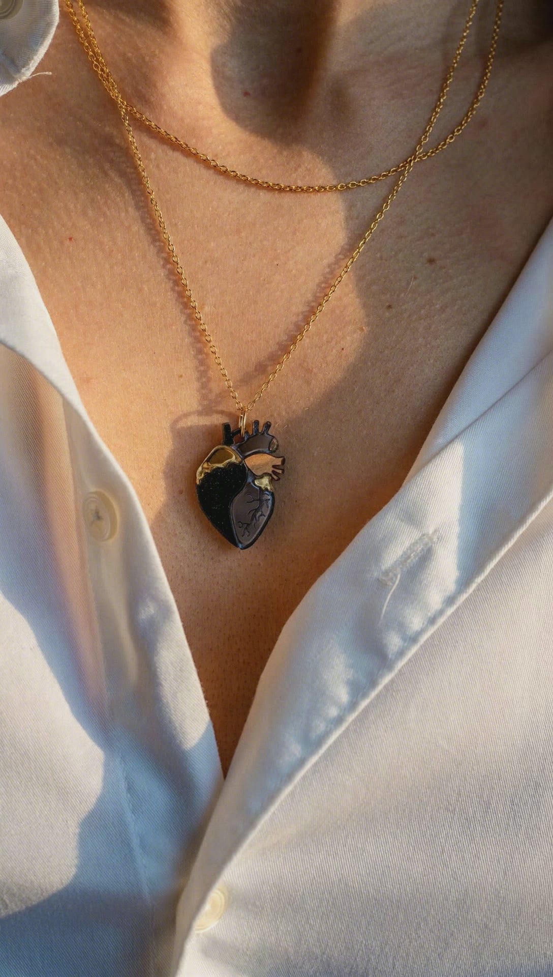 Eine atemberaubende handgefertigte Halskette in Form eines anatomischen Herzens, die Kunst, Wissenschaft und Stil zu einem wirklich einzigartigen Schmuckstück vereint.