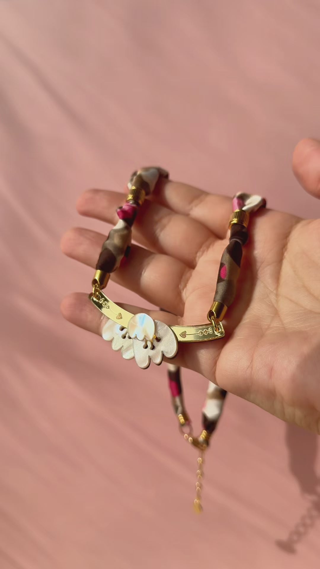 Die Stoffkordel ist aus upcycelter Kleidung gefertigt, was jeder Kette neben ihrer Schönheit auch eine stille Geschichte verleiht. Die Muster können von Stück zu Stück leicht variieren, sodass jedes ein bisschen anders ist als das nächste.